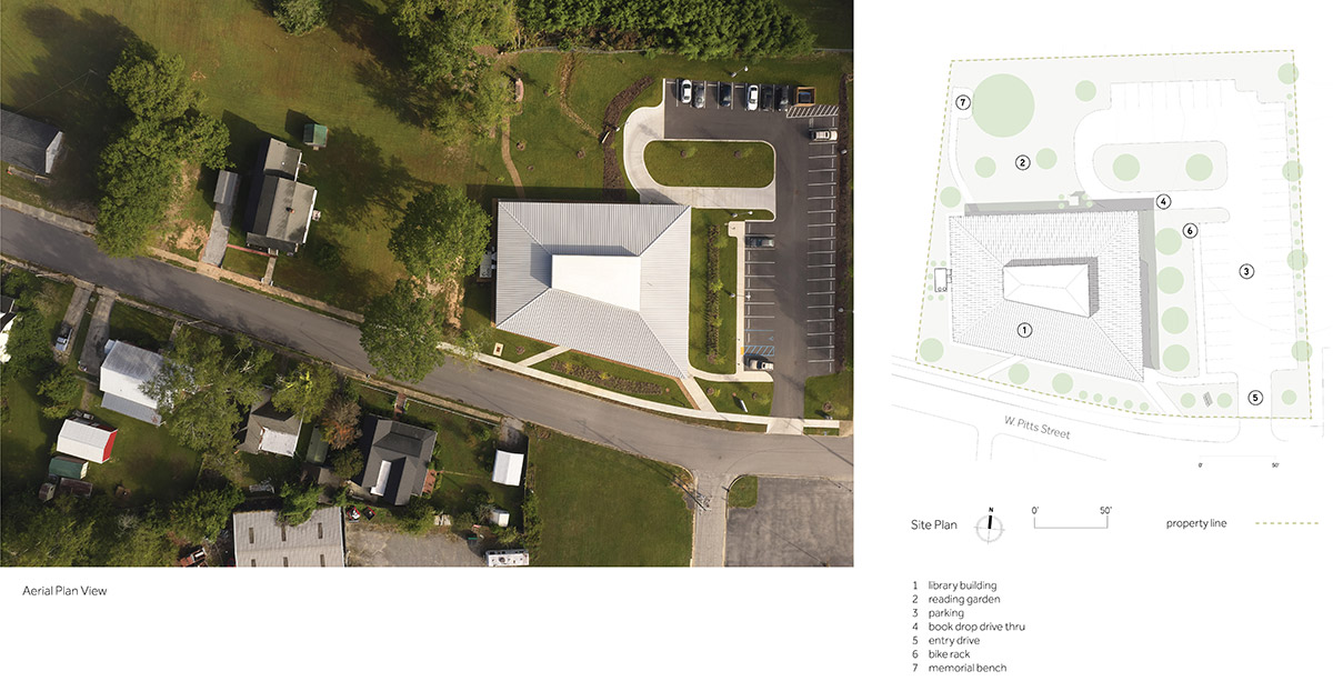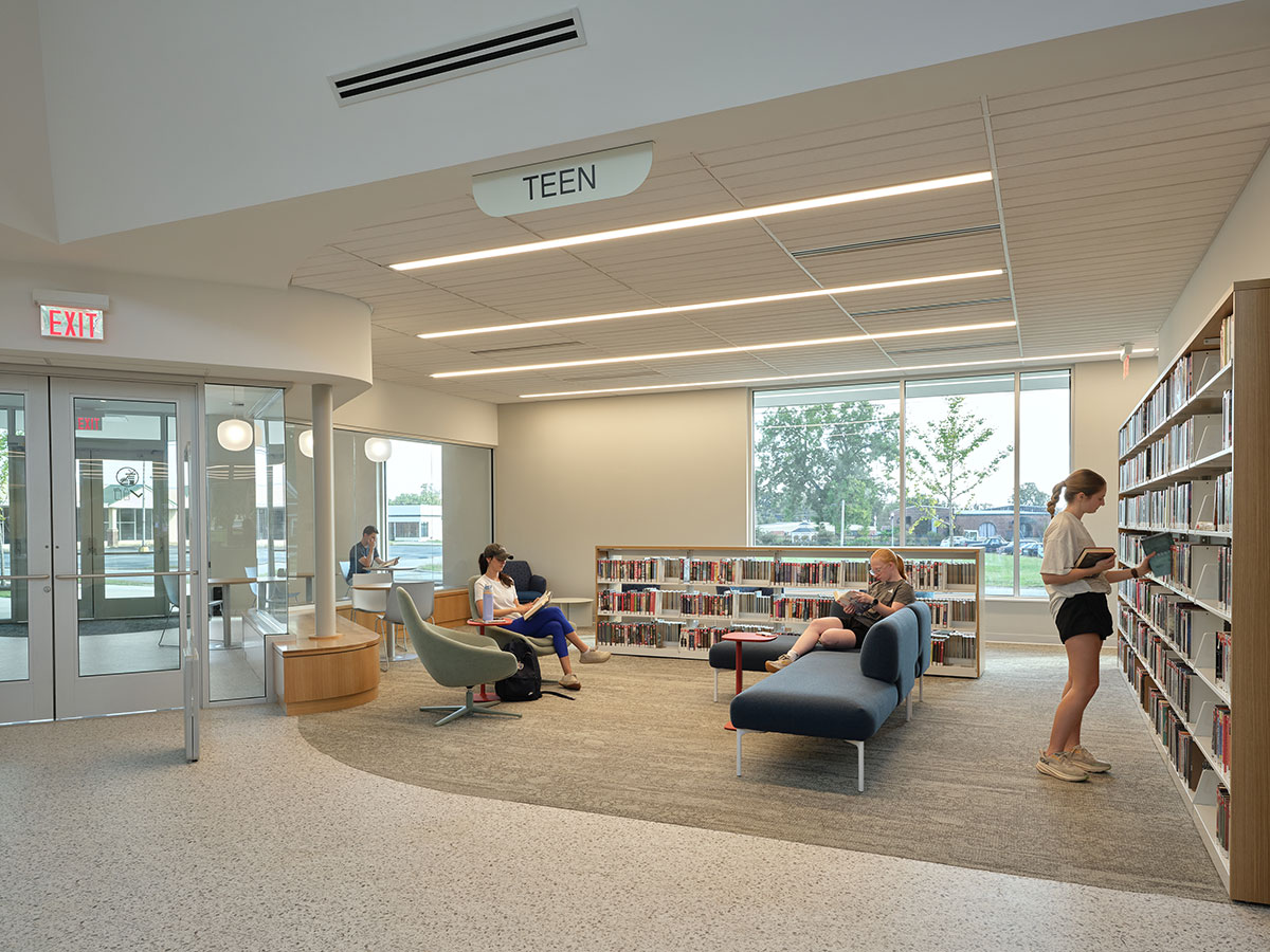The design of the library is organized around a central circulation space highlighted by a large clerestory above that allows natural light to flow into the core of the building. Functional elements include a large meeting room, children’s room, teen lounge area, private study rooms, and a workshop. Outside features include a front porch with custom bench seating and a large reading garden in the back.