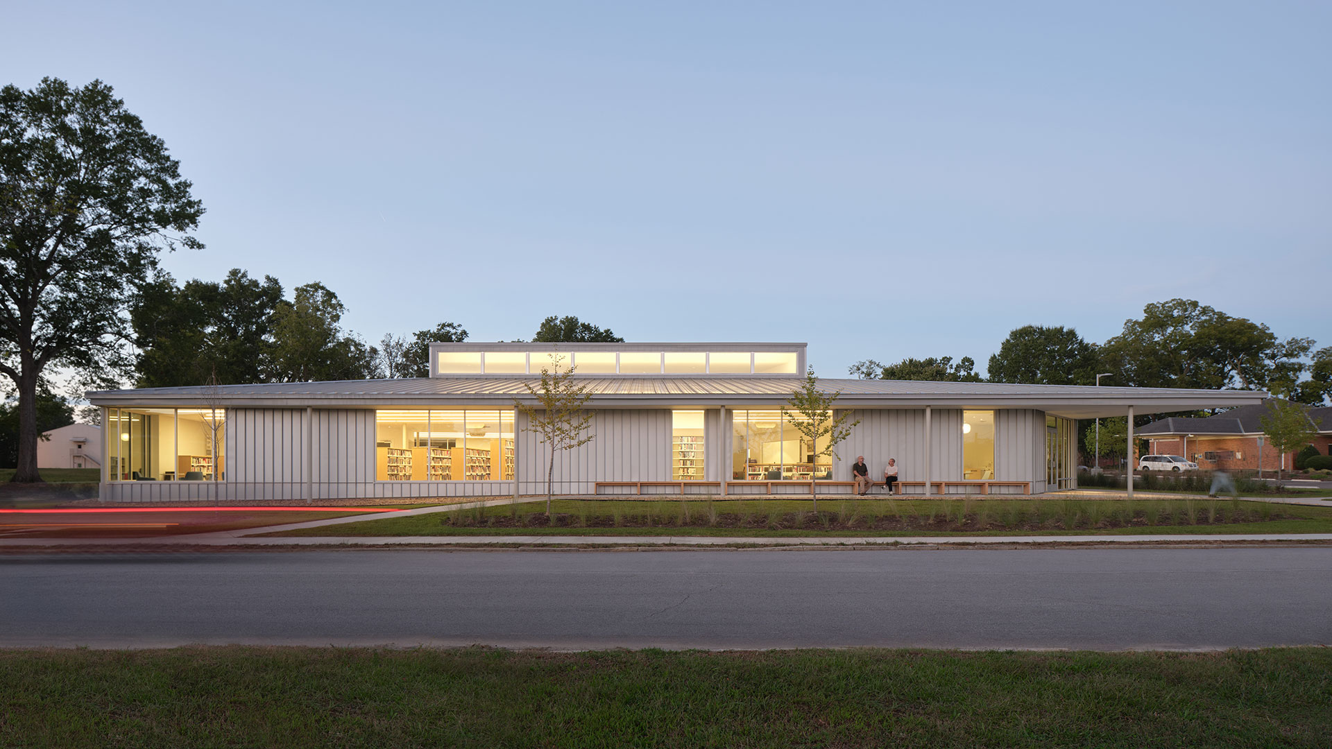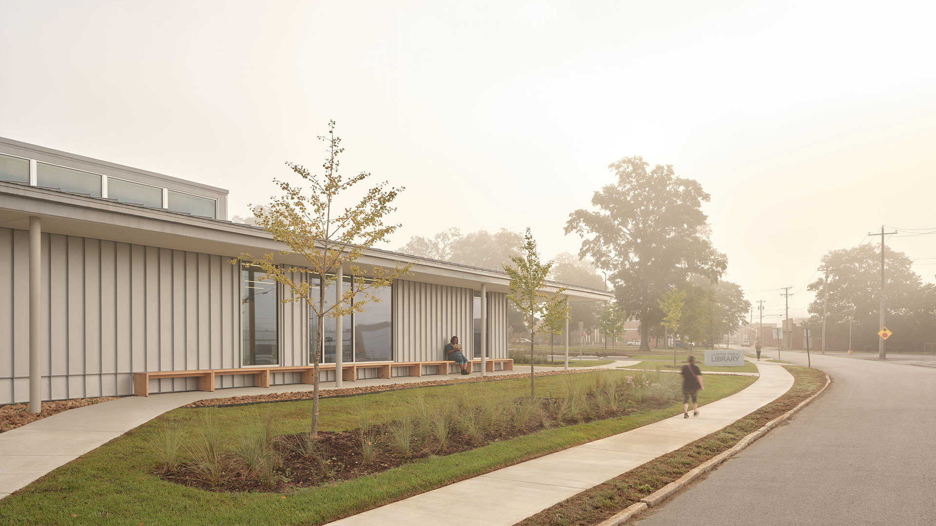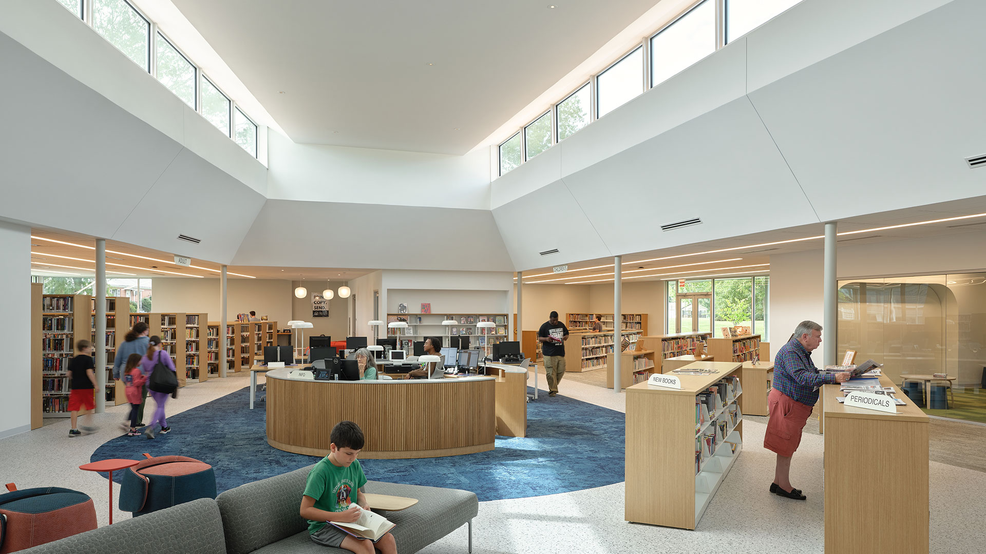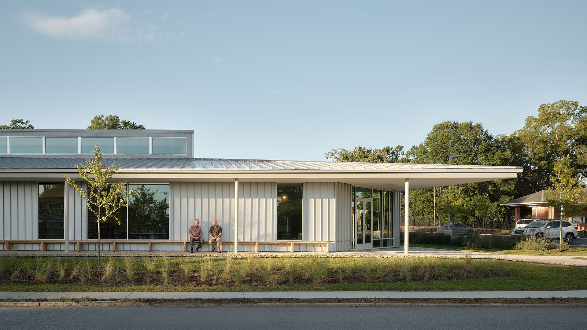 The design of the library is organized around a central circulation space highlighted by a large clerestory above that allows natural light to flow into the core of the building. Functional elements include a large meeting room, children’s room, teen lounge area, private study rooms, and a workshop. Outside features include a front porch with custom bench seating and a large reading garden in the back.