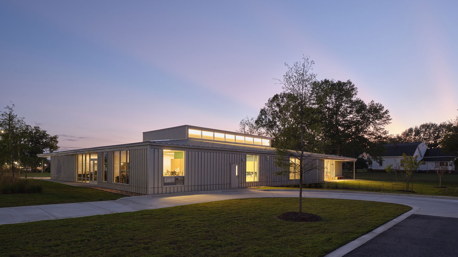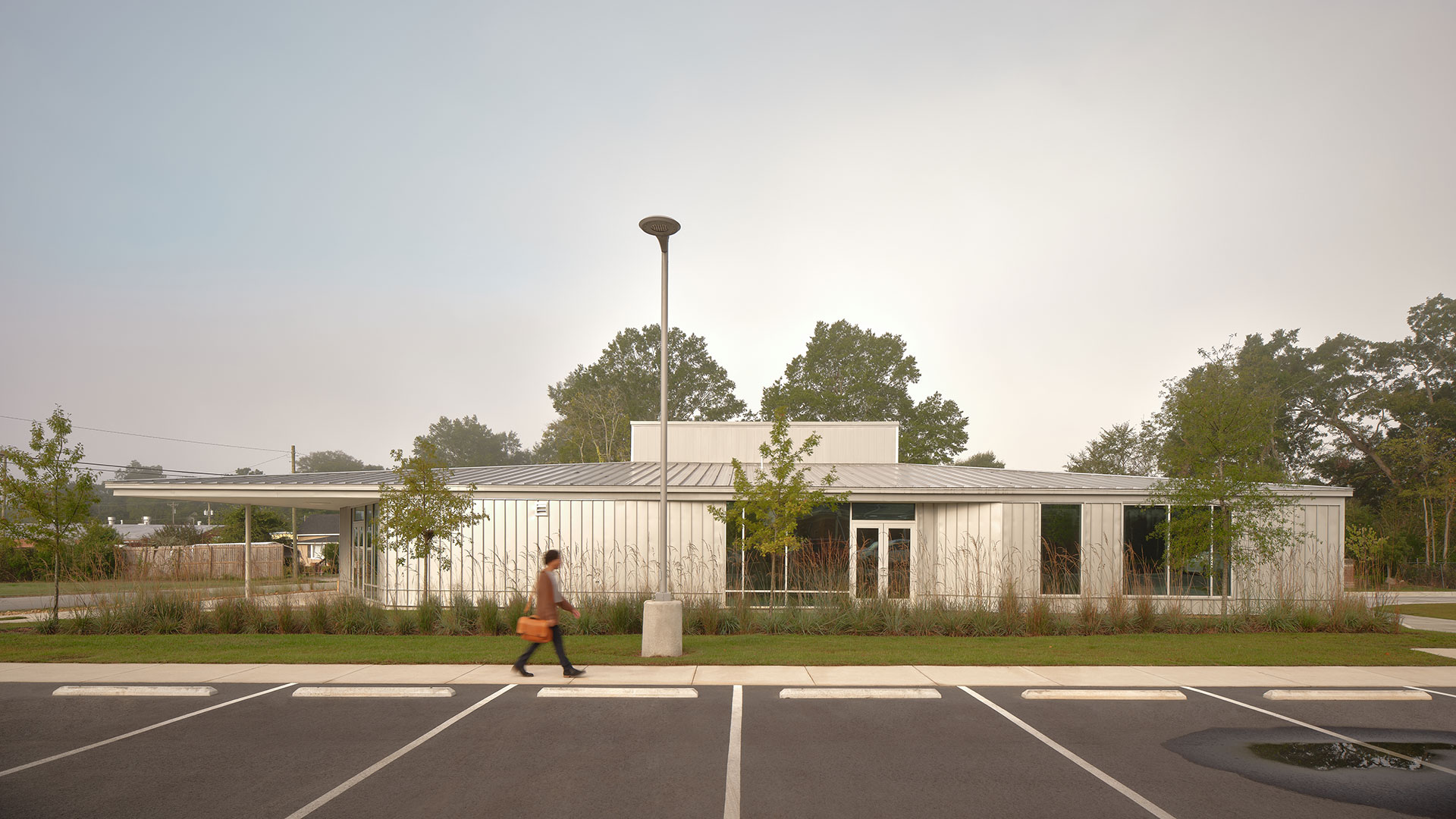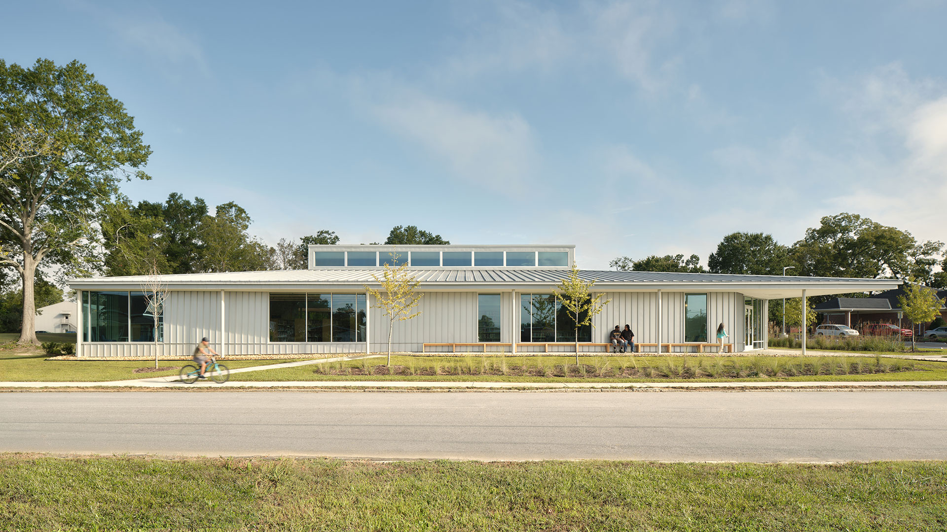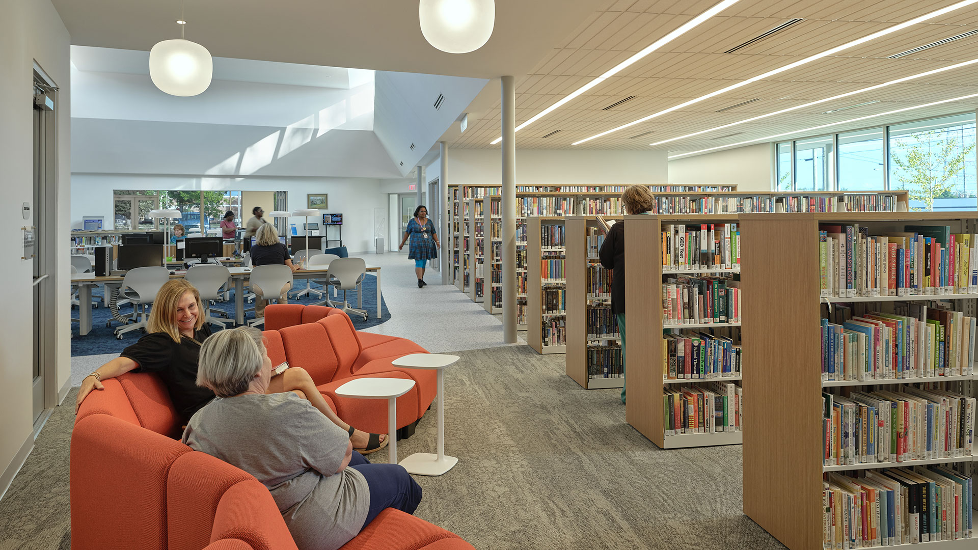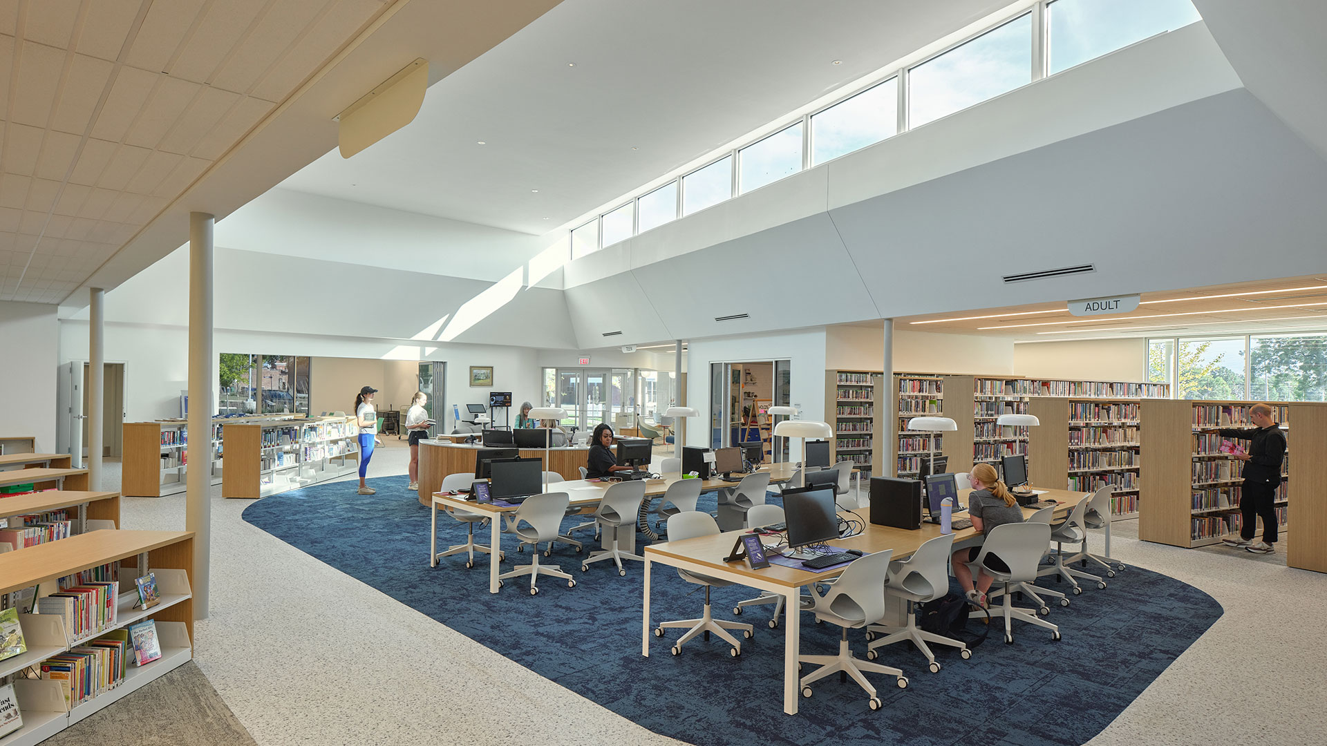 The design of the library is organized around a central circulation space highlighted by a large clerestory above that allows natural light to flow into the core of the building. Functional elements include a large meeting room, children’s room, teen lounge area, private study rooms, and a workshop. Outside features include a front porch with custom bench seating and a large reading garden in the back.